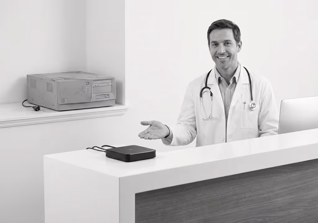 - Alt (Einbox-Konnektor): Das Gerät steht physisch in Ihrer Praxis. Es nimmt Platz weg, verstaubt und muss vor Diebstahl geschützt werden.